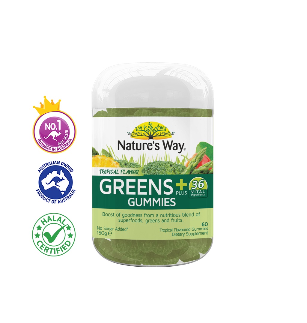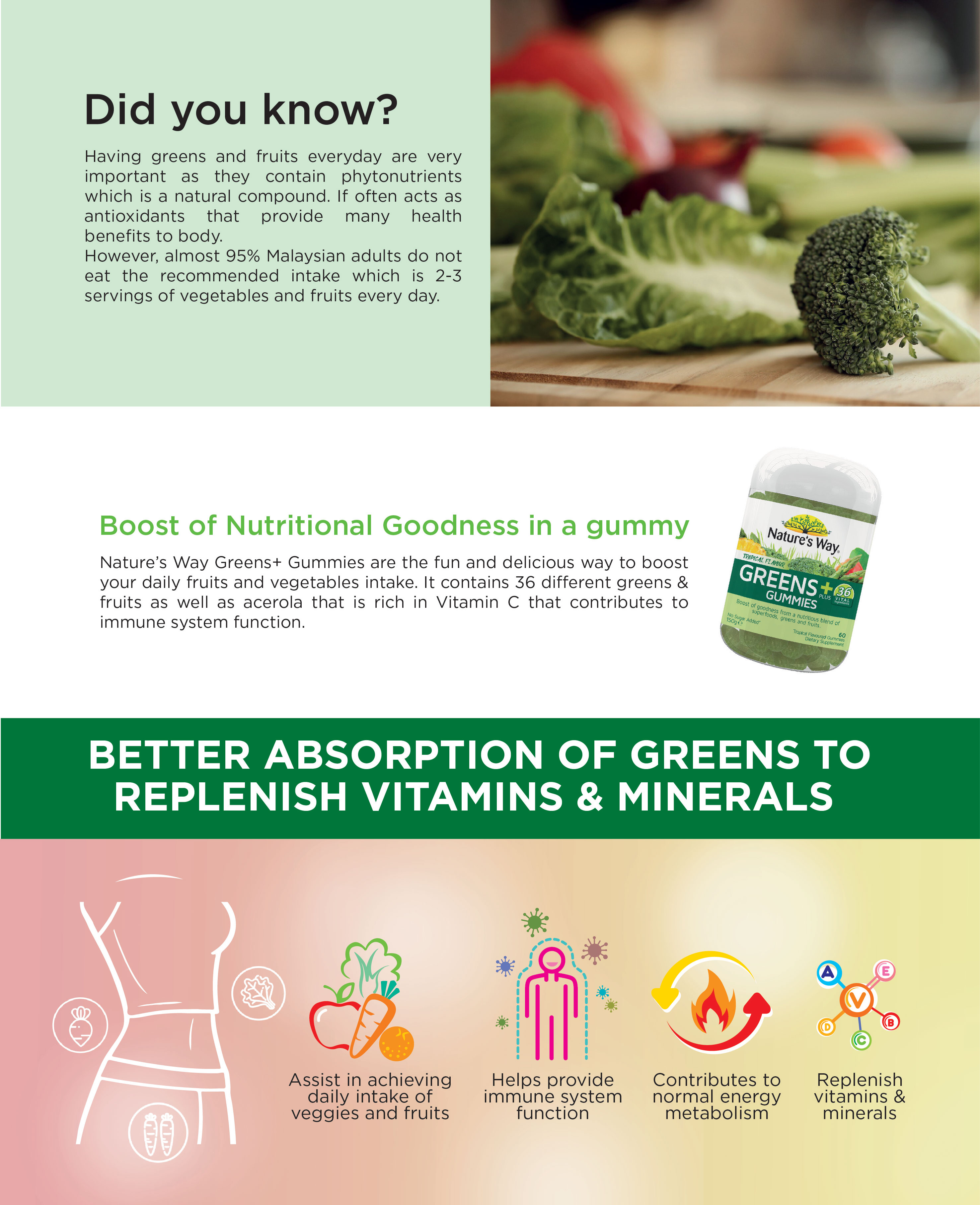 Nature’s Way Greens+ Gummies are the fun, delicious and nutritious way to boost your greens and fruits intake. It also contains acerola that is rich in vitamin C that contributes to normal energy metabolism and immune system function.
