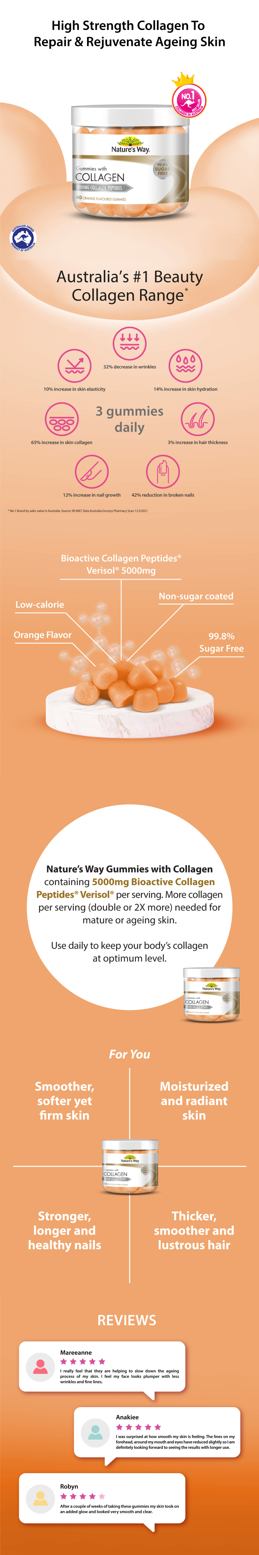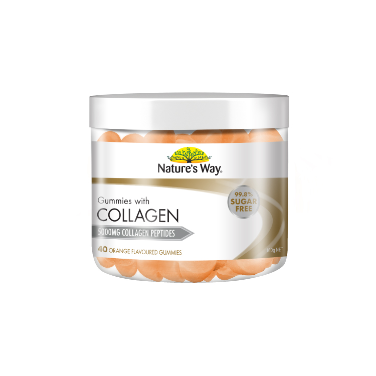 Nature’s Way Gummies with Collagen containing 5000mg Bioactive Collagen Peptides® Verisol® per serving. More collagen per serving (double or 2X more) needed for mature or ageing skin.