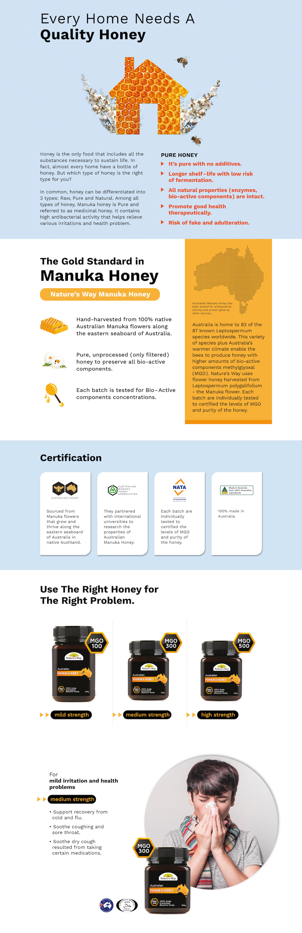Honey is the only food that includes all the substances necessary to sustain life. In fact, almost every home have a bottle of honey. But which type of honey is the right type for you? In common, honey can be differentiated into 3 types: Raw, Pure and Natural. Among all types of honey, Manuka honey is Pure and referred to as medicinal honey. It contains high antibacterial activity that helps relieve various irritations and health problem