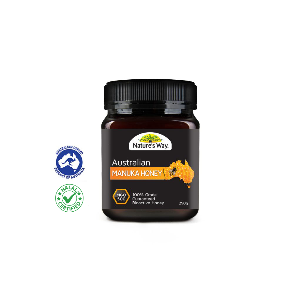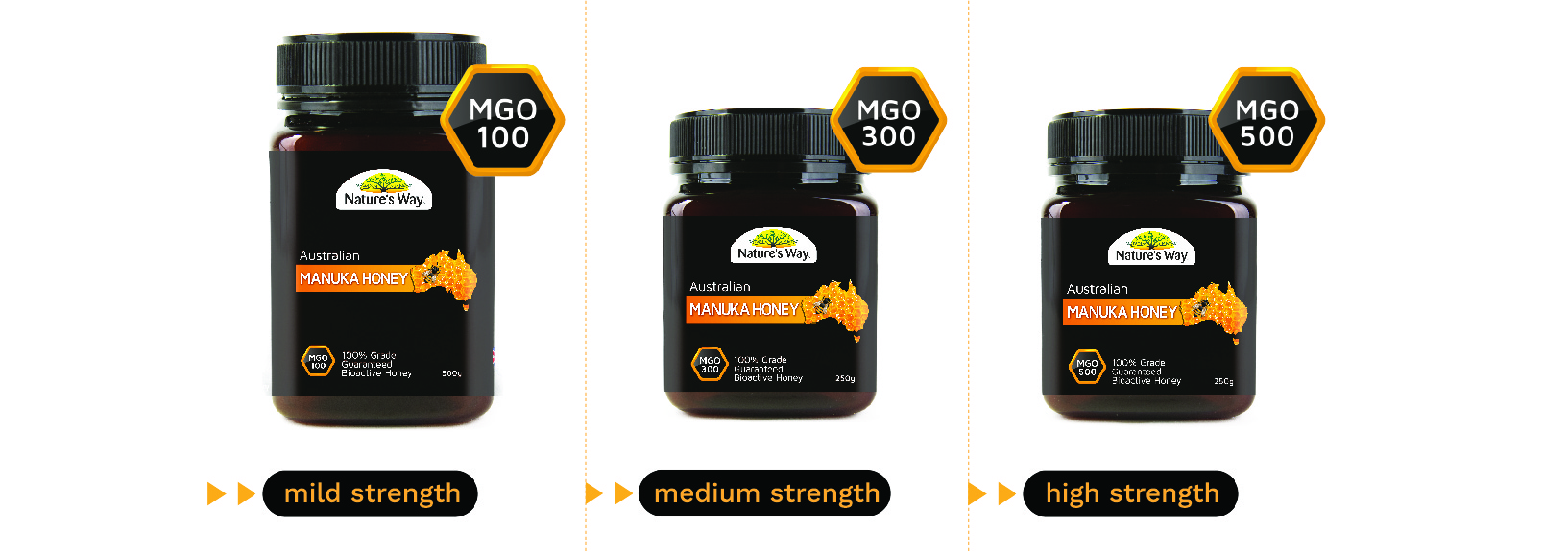 Australia is home to 83 of the 87 known Leptospermum species worldwide. This variety of species plus Australia’s warmer climate enable the bees to produce honey with higher amounts of bio-active components methylglyoxal (MGO). Nature’s Way uses flower honey harvested from Leptospermum polygalifolium – the Manuka flower. Each batch are individually tested to certified the levels of MGO and purity of the honey.